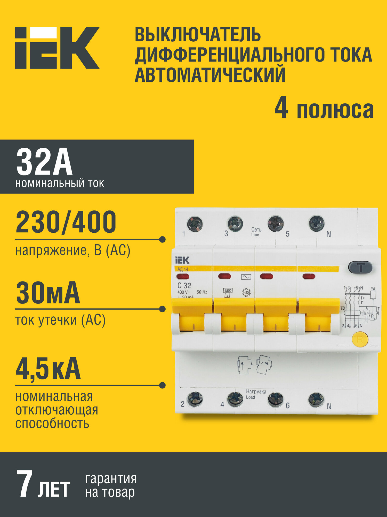 Дифференциальный автомат IEK АД14 4П 30 мА C 4.5 кА AC электронный 32 А