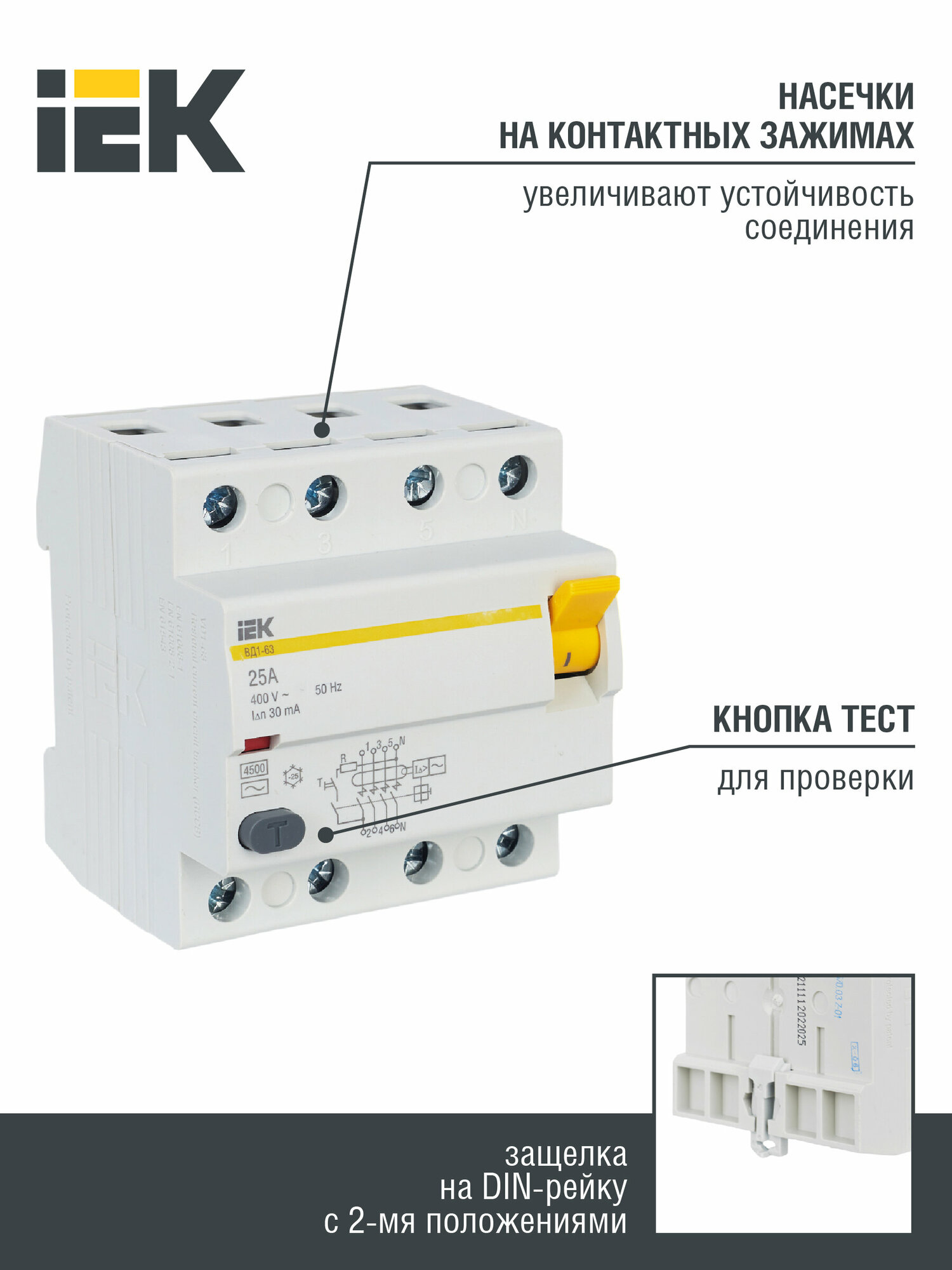 Дифференциальный выключатель нагрузки УЗО ВД1-63 4 полюса, 25А, Тип AC, 30мА. MDV10-4-025-030 IEK (2шт.)
