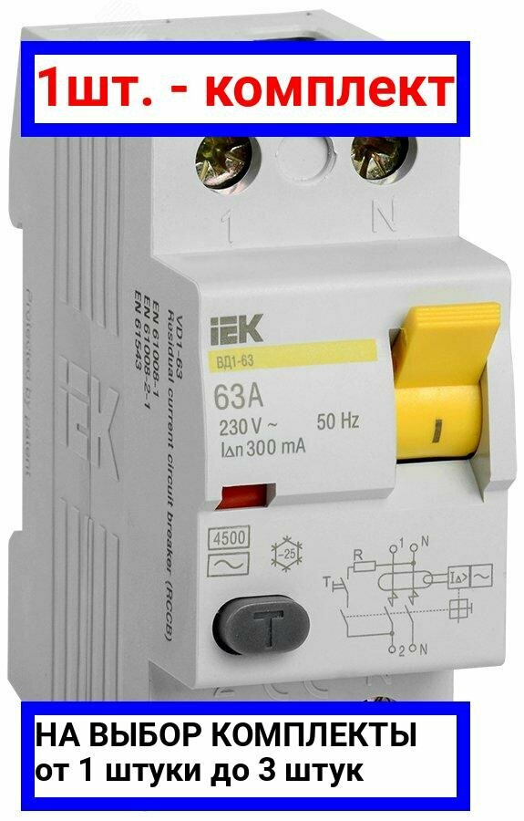 УЗО 2P 63А 300мА 4,5кА ВД1-63 (IEK), арт. MDV10-2-063-300