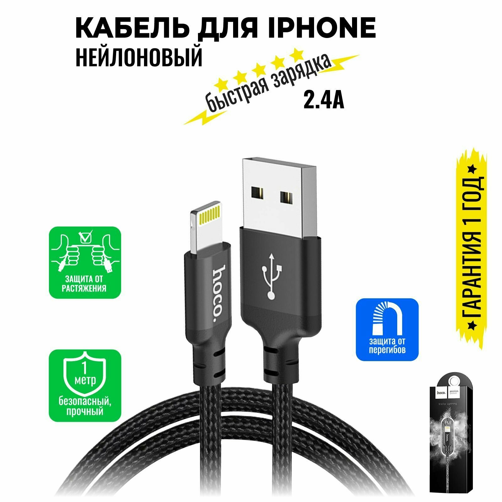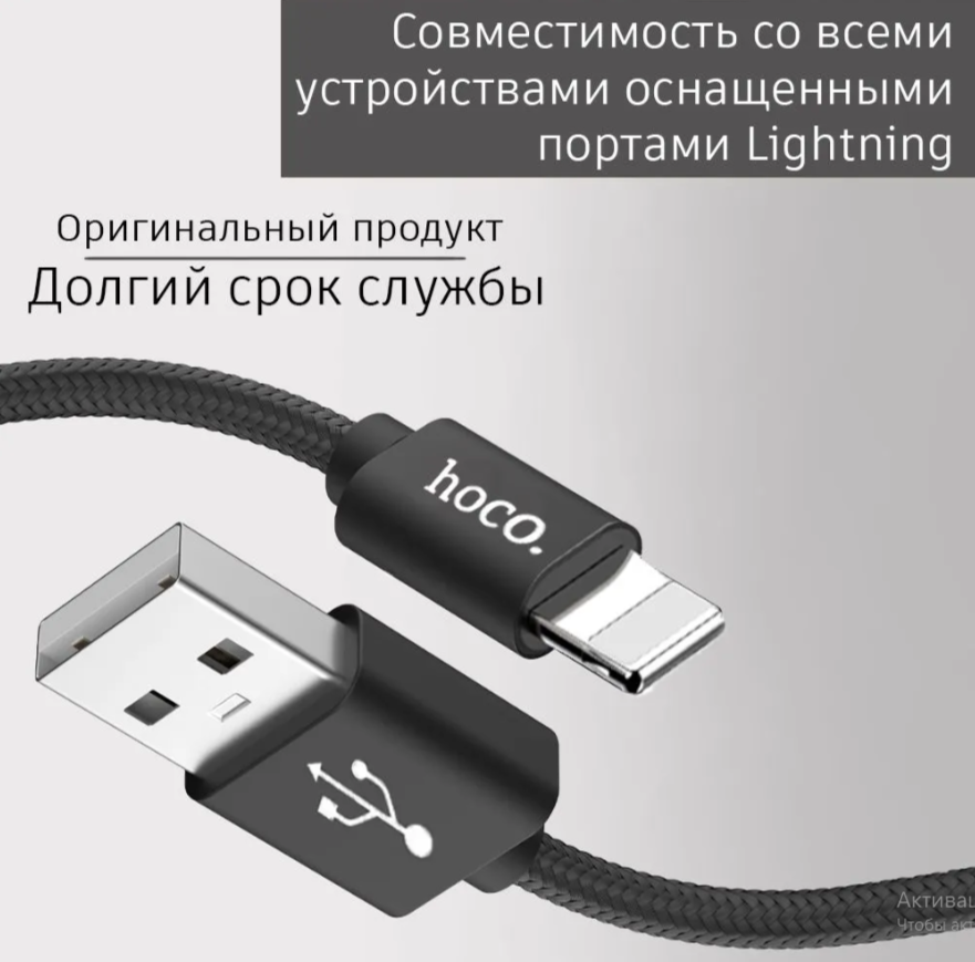 Кабель для iPhone, быстрая зарядка, 2 метра, нейлоновый, передача данных / USB провод для iPad airPods / шнур для разъема Lightning / Hoco. X14