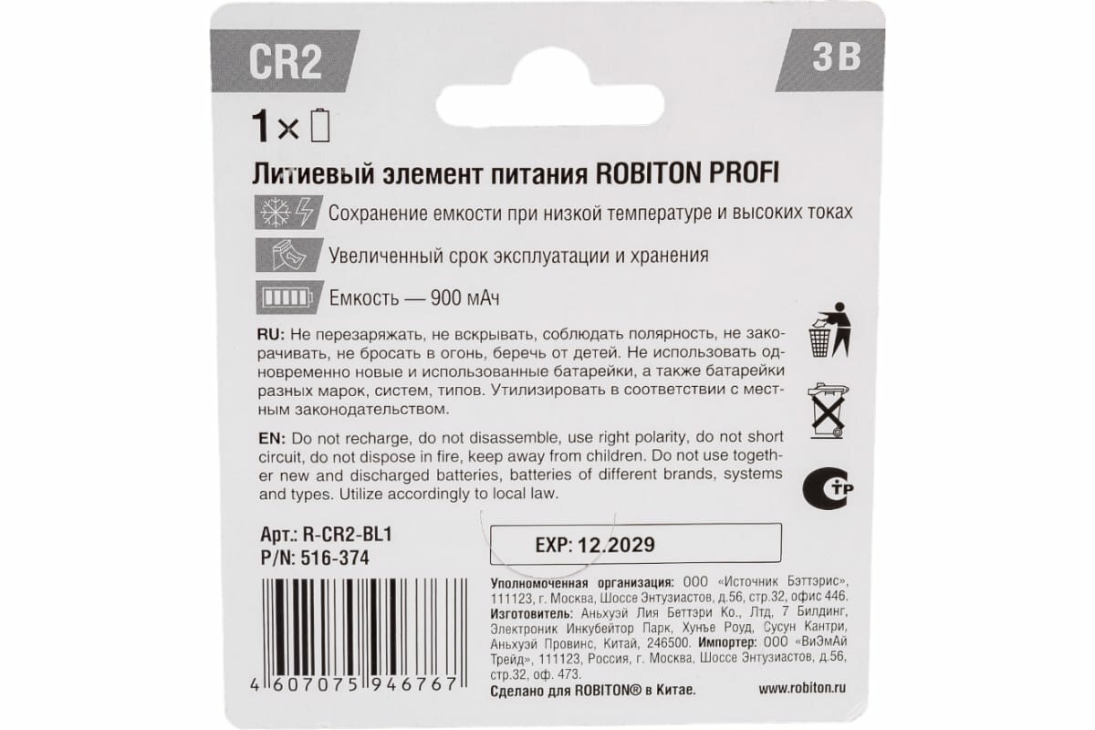 Ниже Вы можете прочитать отзывы на Элемент питания Robiton PROFI R-CR2-BL1 CR2 BL1 13262, ознакомится с подробными характеристиками, посмотреть интересные обзоры и фотографии на Элемент питания Robiton PROFI R-CR2-BL1 CR2 BL1 13262.