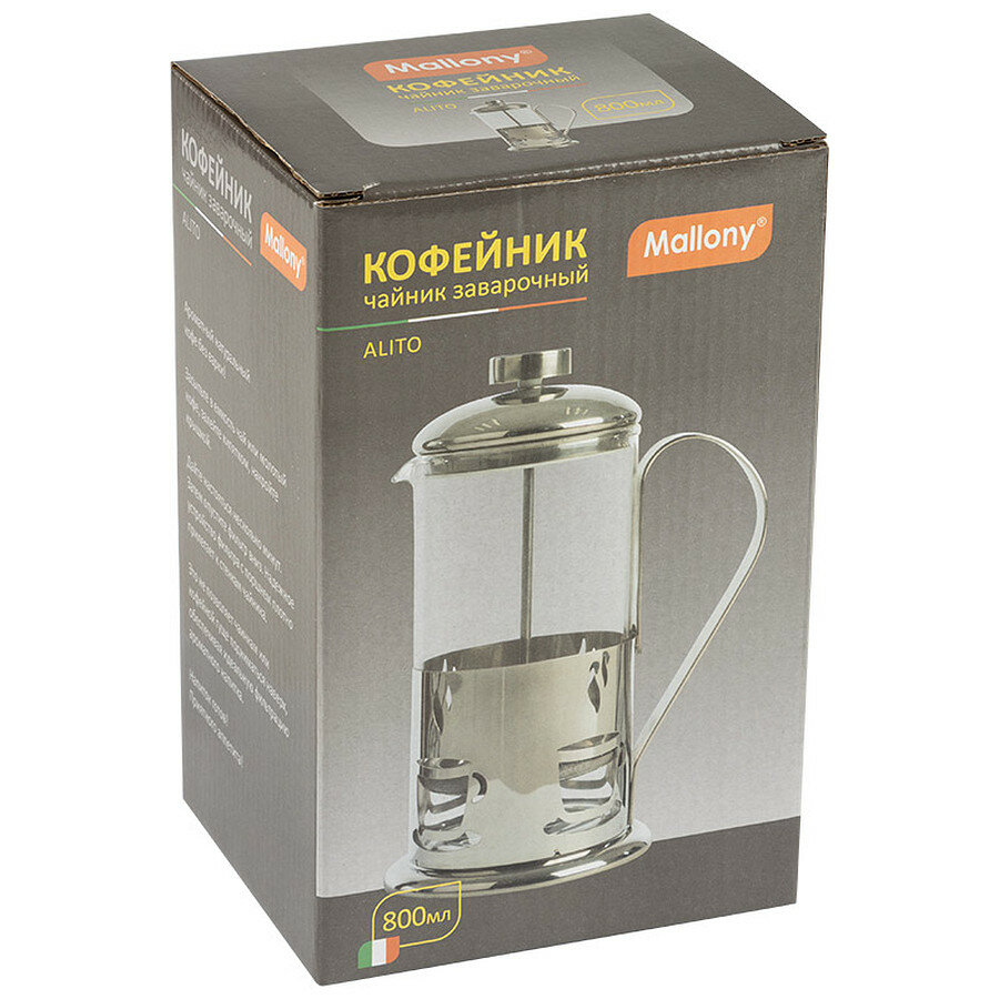 Купить Френч-пресс 0.8 л, стекло, нержавеющая сталь, Mallony, Alito, 950151