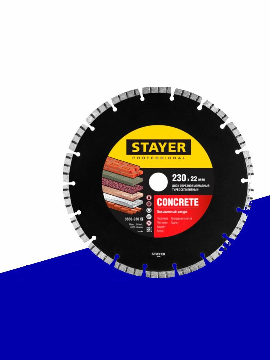 STAYER BETON 230 мм, диск алмазный отрезной по бетону, кирпичу, плитке, граниту, черепице, песчанику (230х22.2мм, 7х2.4мм), ( 3660-230_z02 )