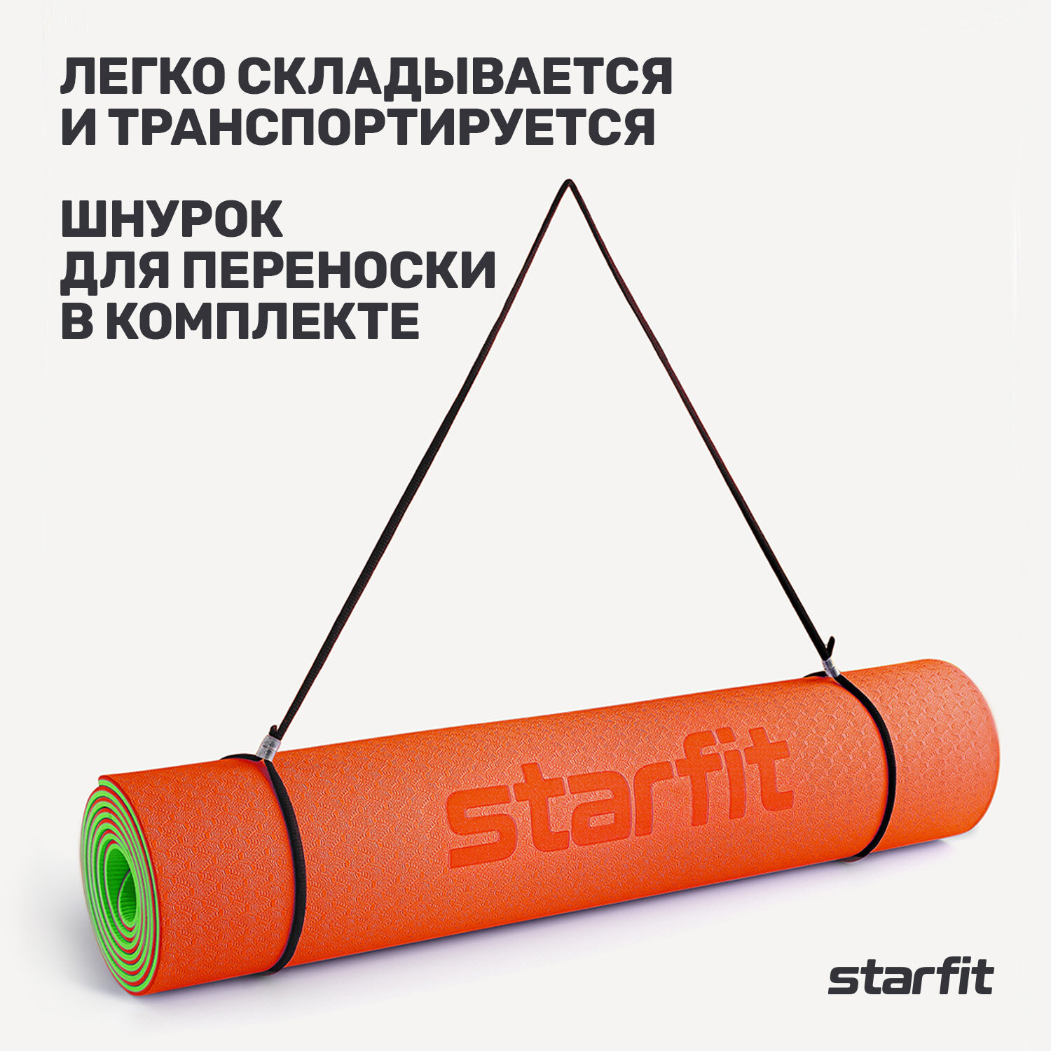 Коврик для йоги и фитнеса STARFIT FM-201, TPE, 183x61x0,4 см, оранжевый/зеленый с шнурком для переноски
