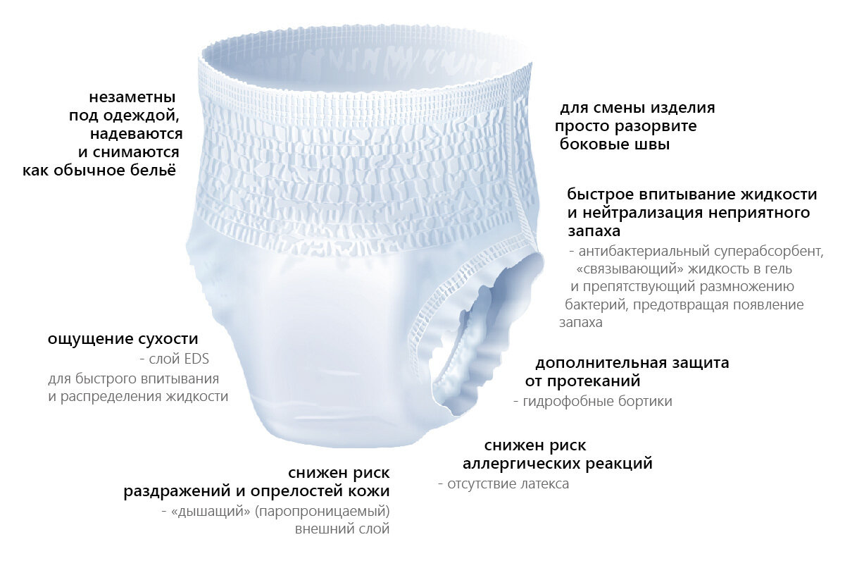 | Плюсы: | Имитируют обычные трусы, очень удобно для ухаживающих за человеком с деменцией |