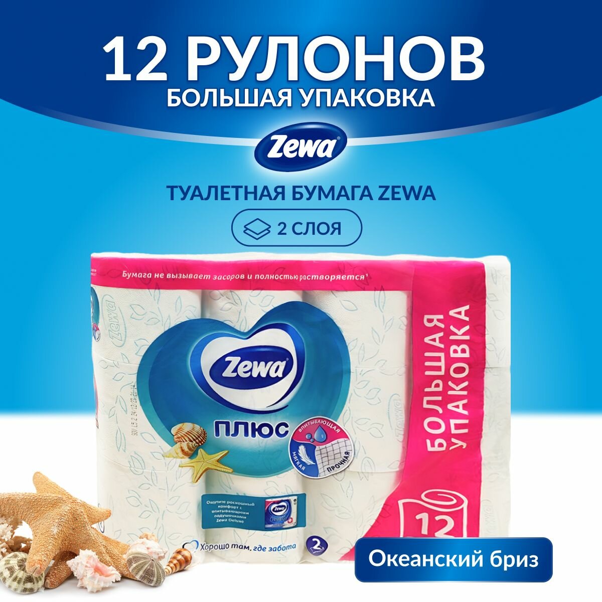 Туалетная бумага Zewa Плюс Свежесть Океана, 2 слоя, 12 рулонов