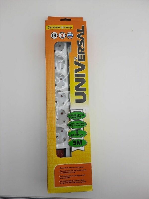 Фильтр UNIVersal сетевой белый 5 м 6 розеток Универсал фильтр сетевого напряжения с защитой 220в, арт. 967U-3005
