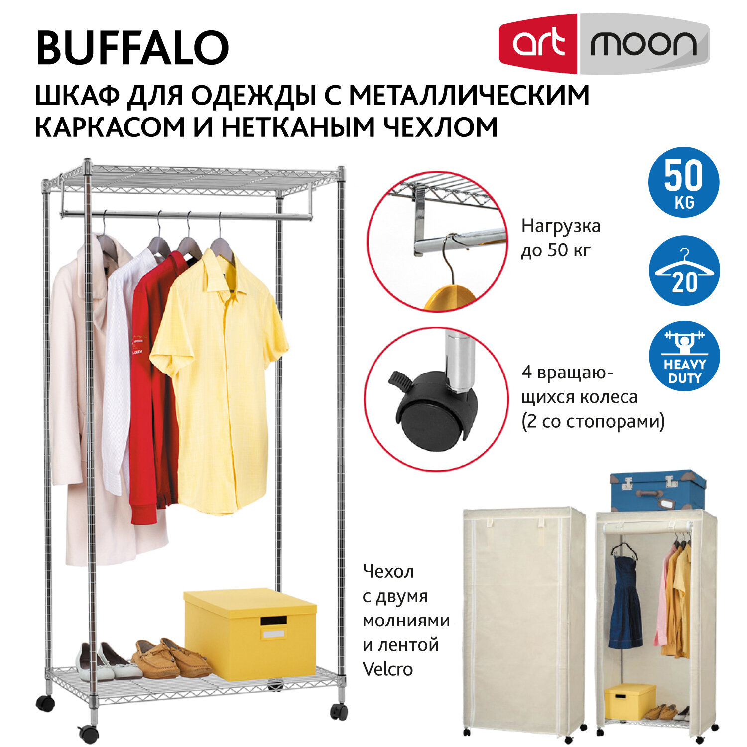 Art moon BUFFALO Сверхмощная стойка с двумя полками и штангой для вешалок, в комплекте с чехлом, Бежевый чехол