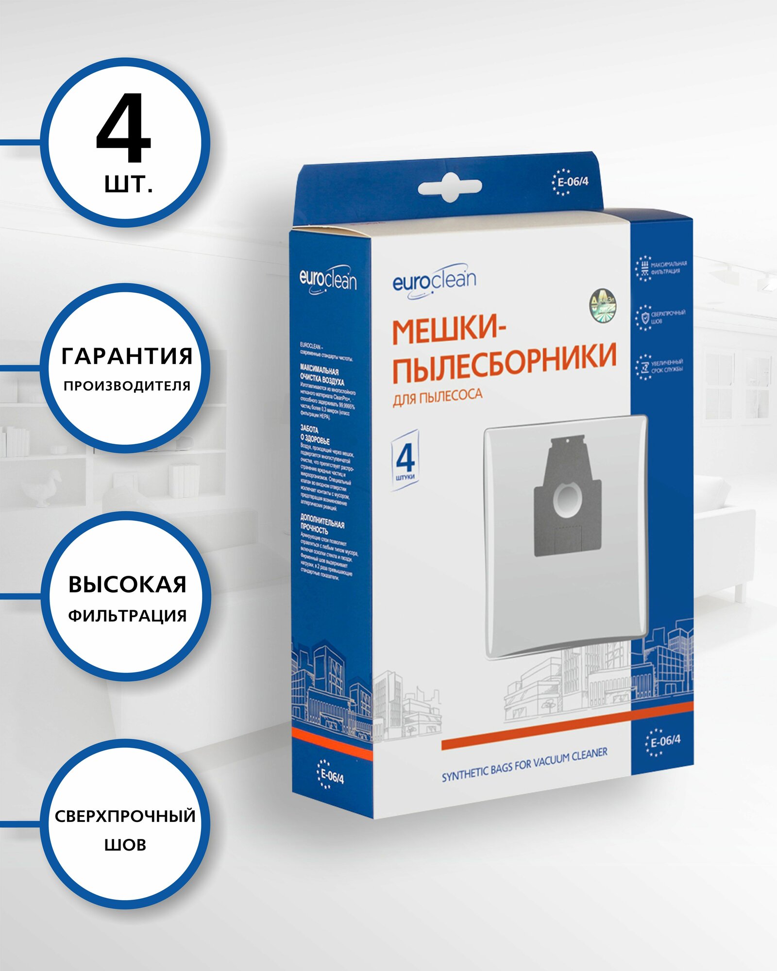 Мешок-пылесборник Euroclean e-06/4 синтетический, многослойный, 4 шт (Bosch/Siemens P)