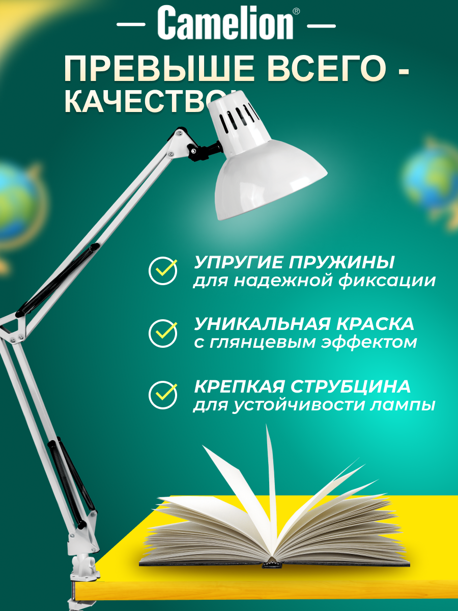 Светильник Camelion KD-312 C01 (5764) настольный, на струбцине, E27, белый, 60 Вт