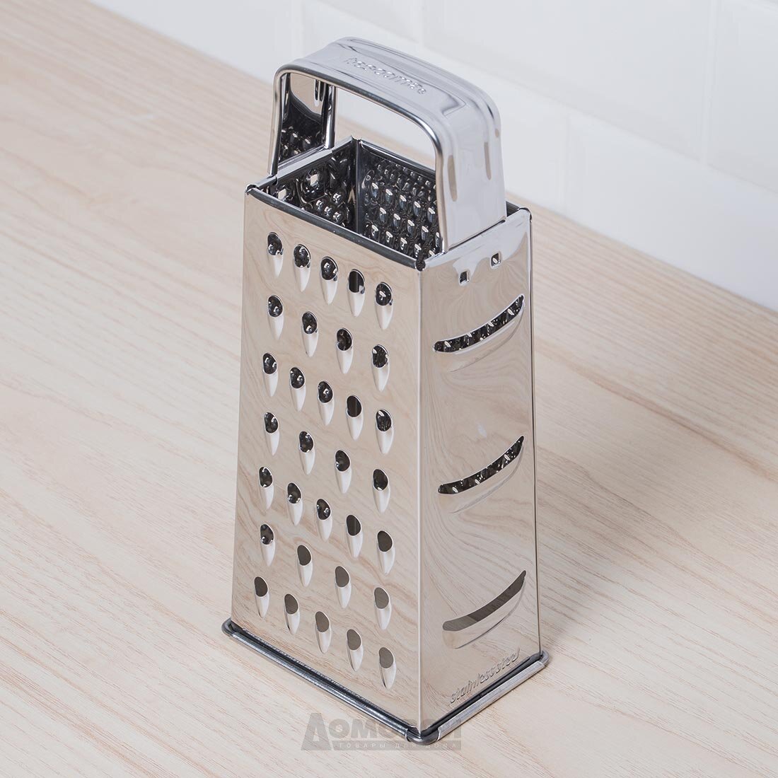 | Плюсы: | Отличного качества терка. Чуть меньше стандартной «советской» терки, но это никак не влияет на функциональность, а места на кухне занимает меньше. |