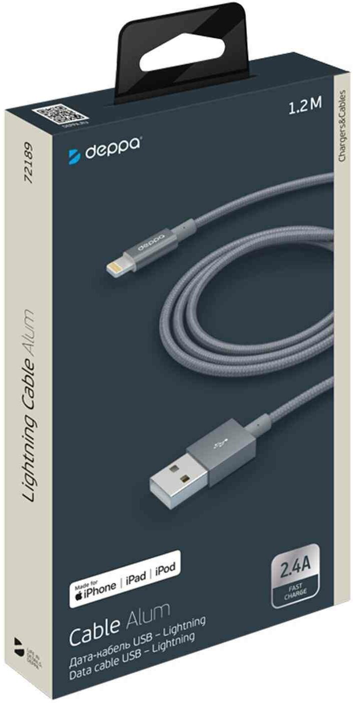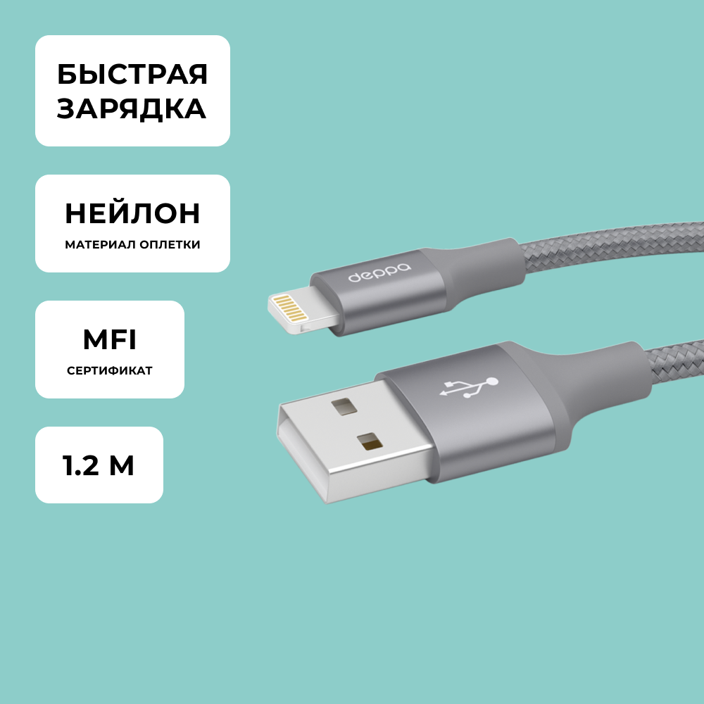 Кабель для Apple Lightning MFI Deppa 1,2м алюминий/нейлон серый