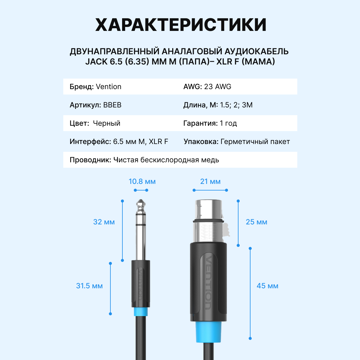 Кабель Vention аудио Jack 6.5 M/XLR F - 1.5м Кабель Vention jack 6.5 mm(m)/XLR(f) - 1.5 м (BBEBG)