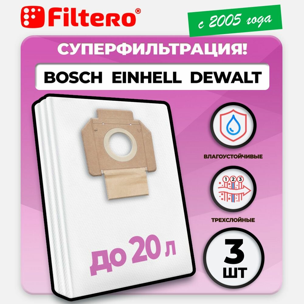 Мешки для пылесоса Bosch, Dewalt, Festool, Flex, Hilti, Nilfisk, Ryobi, Sparky, Stihl, Tmb, Корвет трехслойные синтетические Filtero BSH 15 Pro 20л 2шт 05596
