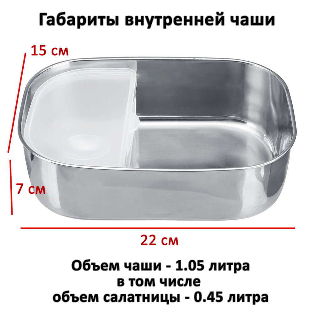 | Плюсы: | Большой объем контейнера, Возможность брать первые и вторые блюда, столовый комплект приборов, пища быстро разогревается |