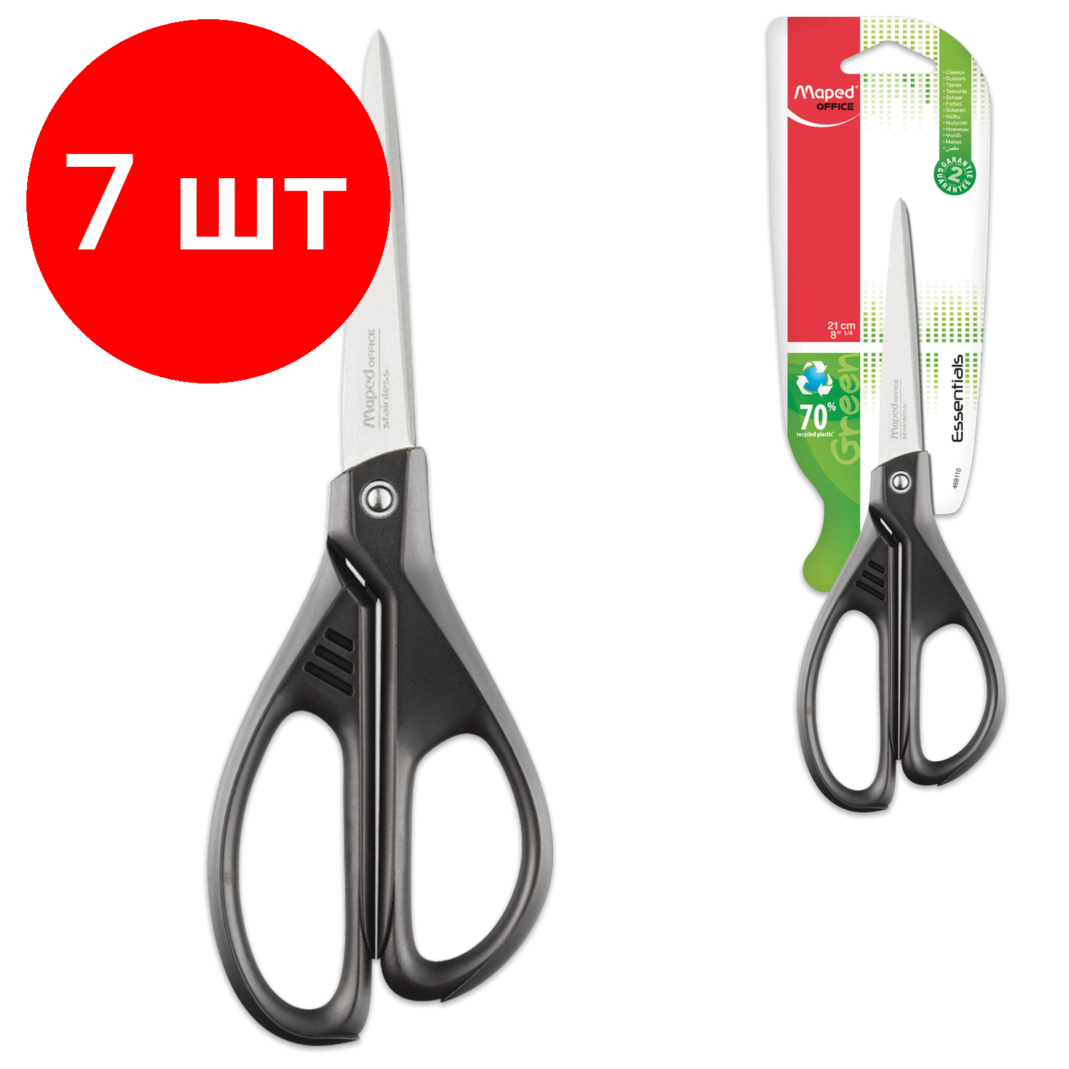 Комплект 7 шт, Ножницы MAPED"Essentials Green", 210 мм, черные, эргономичные ручки, картонная упаковка с европодвесом, 468110