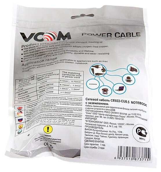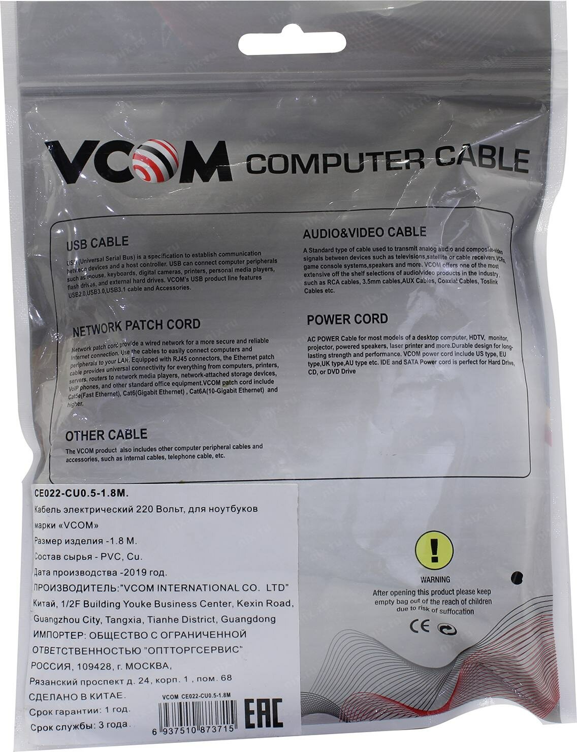 Кабель питания VCOM, для ноутбуков, 3 G 0.5 mm 220V (CE022-CU) VDE стандарт, 1.8 м.