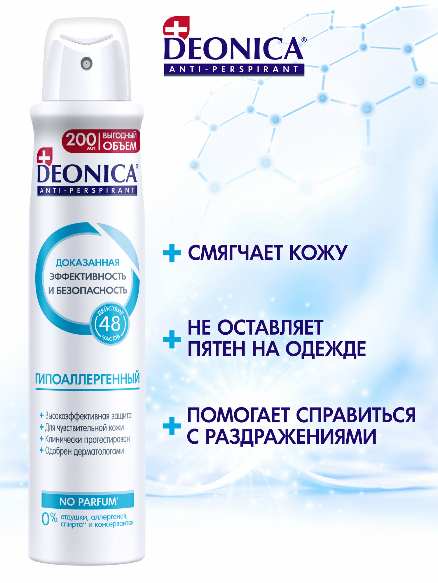 Дезодорант женский антиперспирант Deonica "Гипоаллергенный". Спрей, 200 мл. Без запаха. Не вызывает раздражения кожи