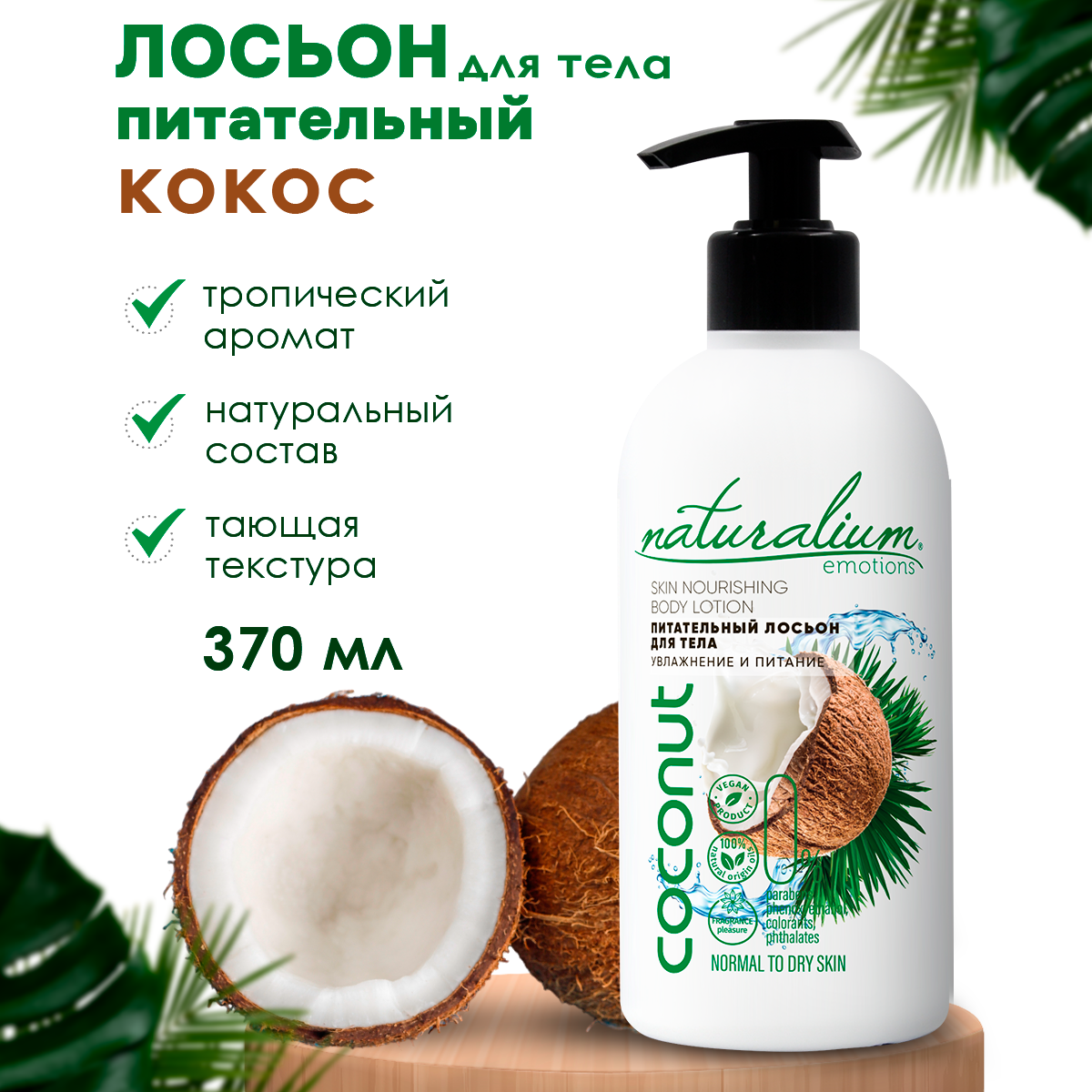 Naturalium Emotions Питательный Лосьон для тела Кокос, 370 мл. Натуральное питательное средство для ухода кожи рук, ног и тела/ веган