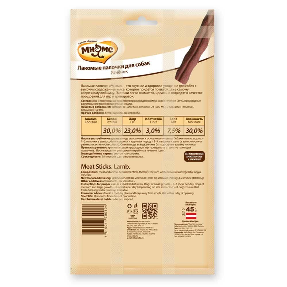 Мнямс лакомые палочки для собак с ягненком - 3х15 г