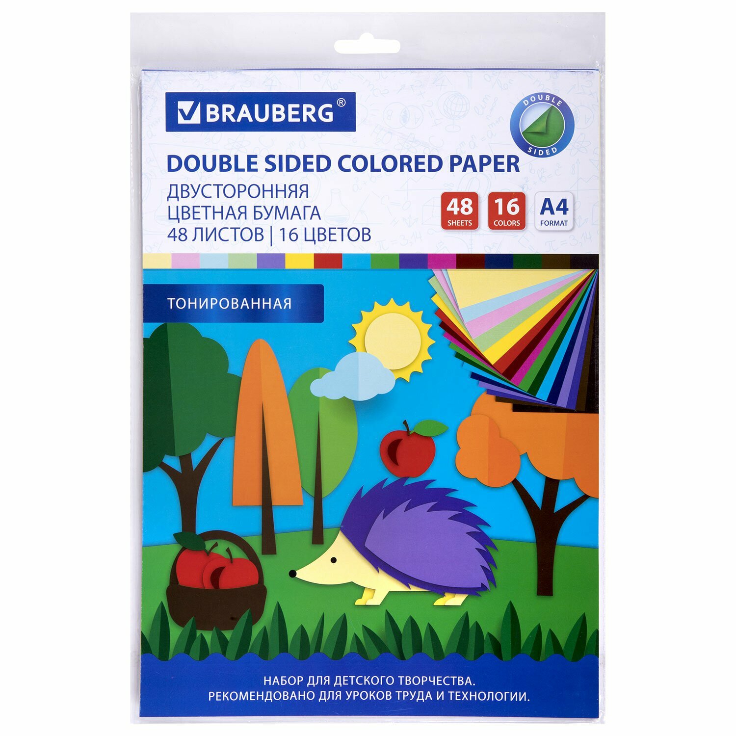 Цветная бумага А4 тонированная В массе, 48 листов 16 цветов, склейка, 80г/м2, BRAUBERG, 113504
