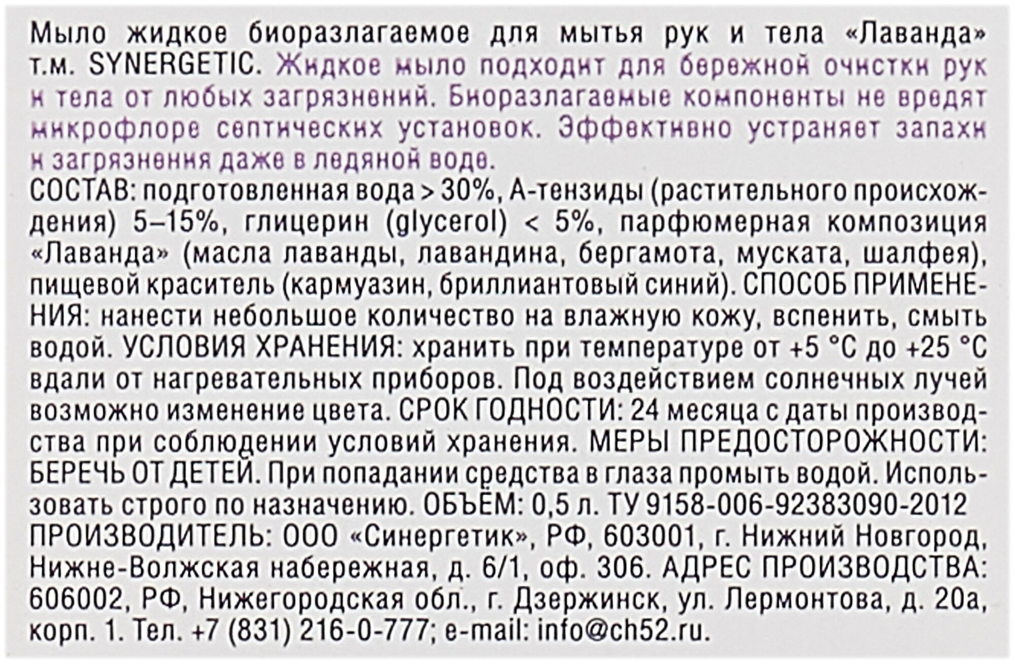 Мыло жидкое Synergetic биоразлагаемое Лаванда, 500 мл