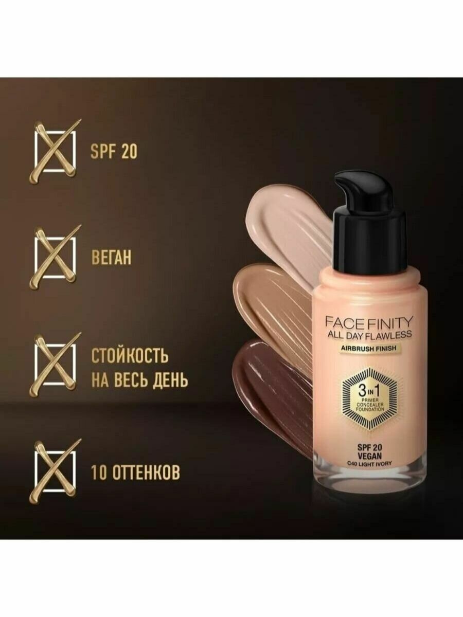 Max Factor Тональная эмульсия Facefinity All Day Flawless 3-in-1, SPF 20, 30 мл, оттенок: 40 Light Ivory
