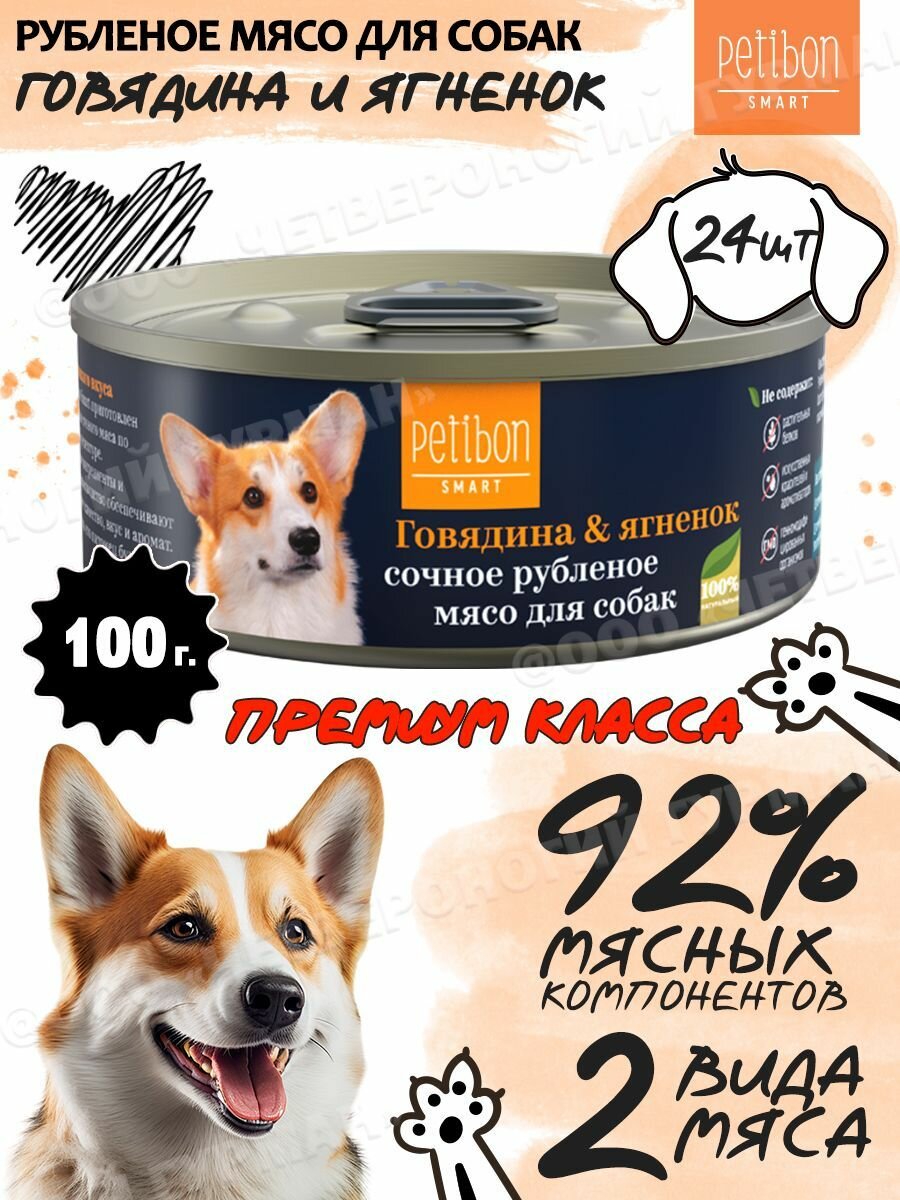 Корм консервированный для собак Petibon Smart для собак "Рубленое мясо с говядиной и ягненком", 100 г х 24 шт.
