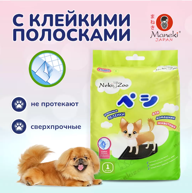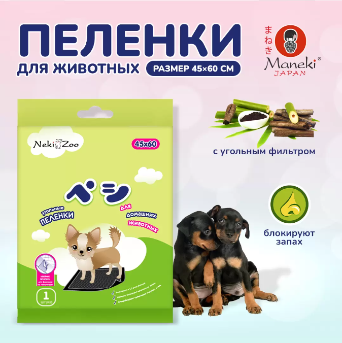 Пеленки гелевые, гигиенические, с липучкой, угольные для животных Maneki NekiZoo 45*60 см, 8 шт