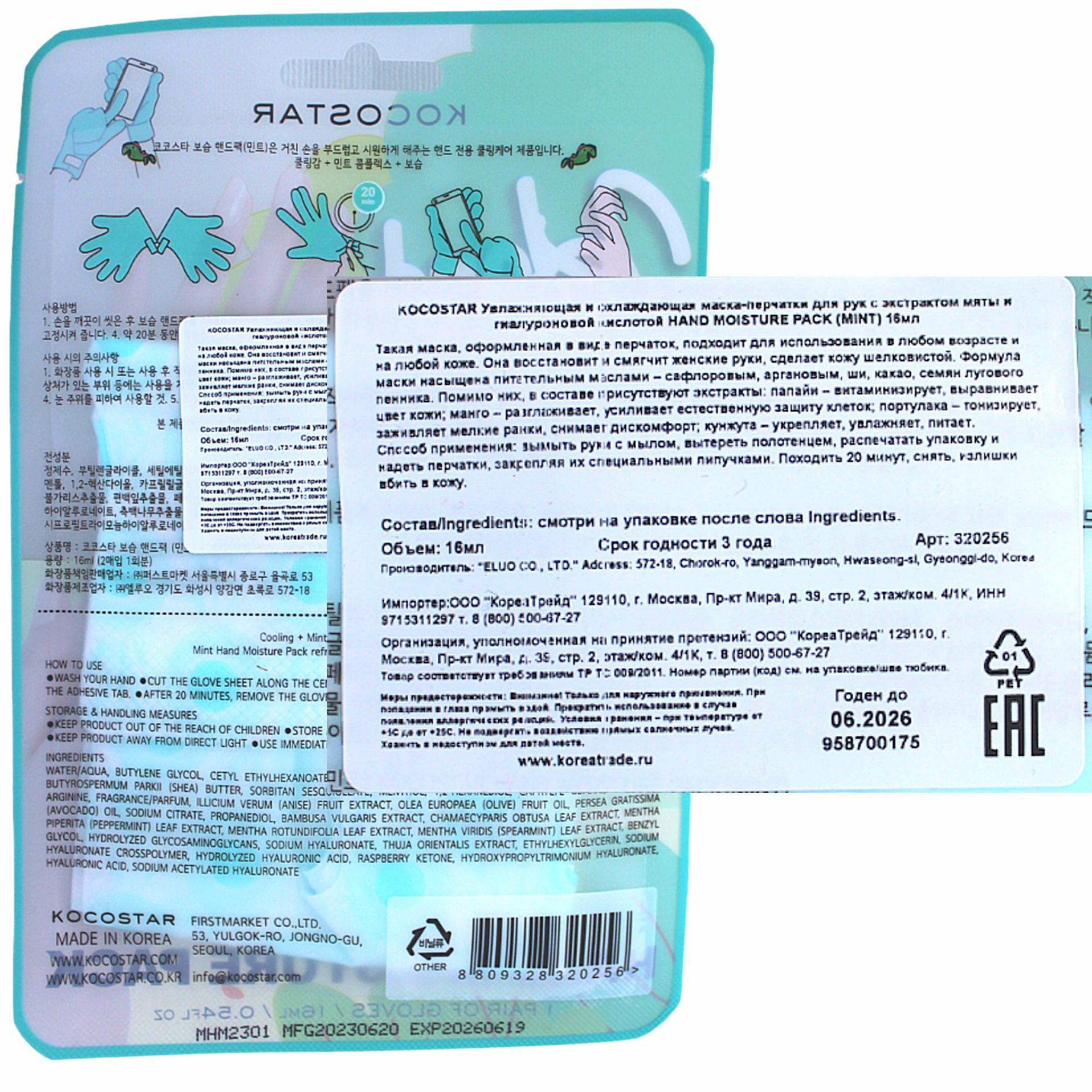 KOCOSTAR HAND MOISTURE PACK (MINT) Увлажняющая и охлаждающая маска-перчатки для рук с экстрактом мяты и гиалуроновой кислотой 16мл