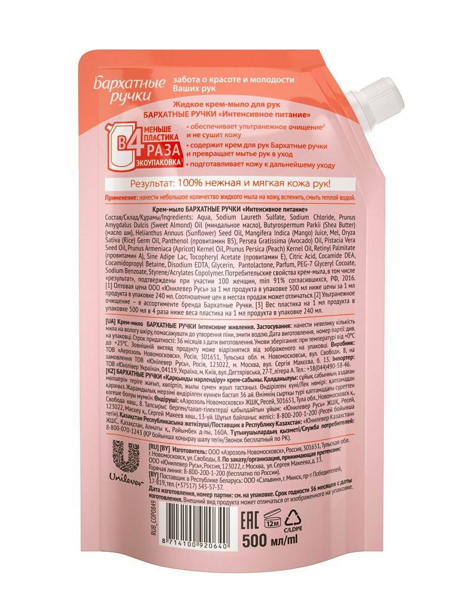 Жидкое крем-мыло Бархатные Ручки Интенсивное питание (запасной блок), 500 мл