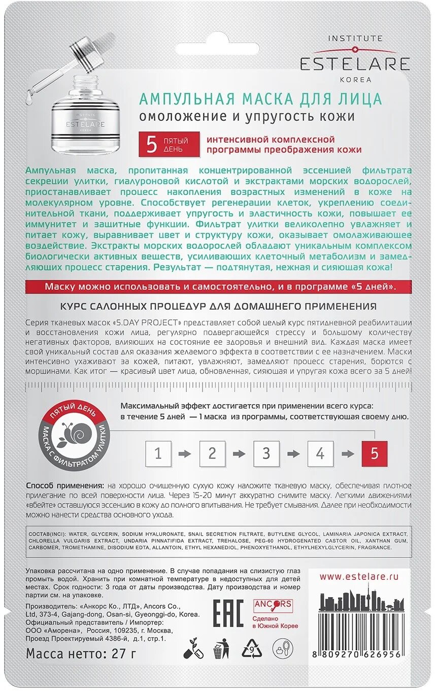 Estelare Ампульная маска (5дней) для лица 5 день "Омоложение и Упругость кожи" 27 г.