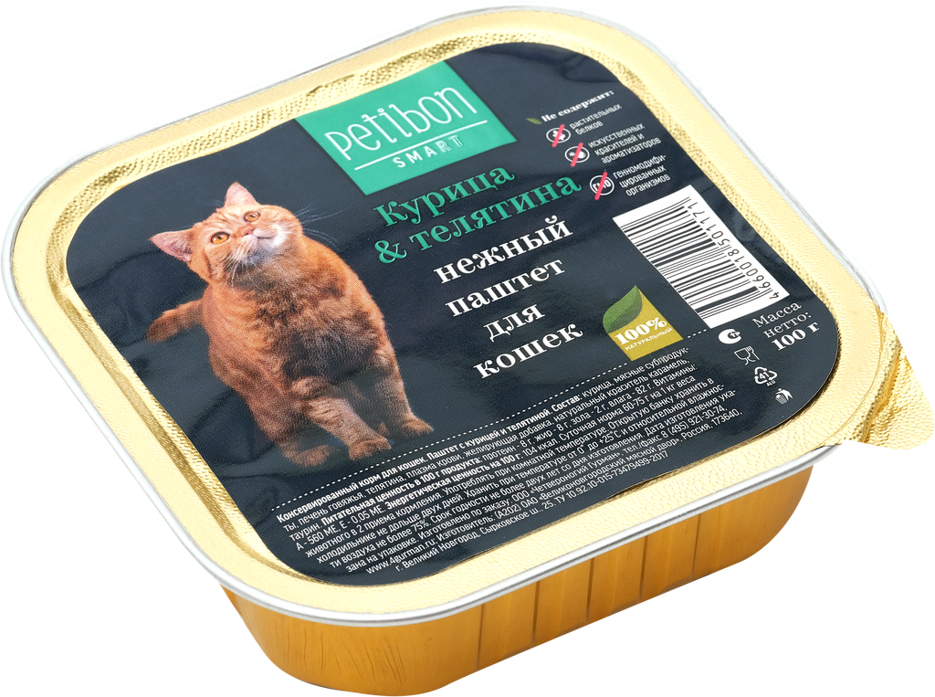 Корм консервированный PETIBON SMART для кошек паштет с курицей и телятиной, упаковка 24 шт. (100 гр)
