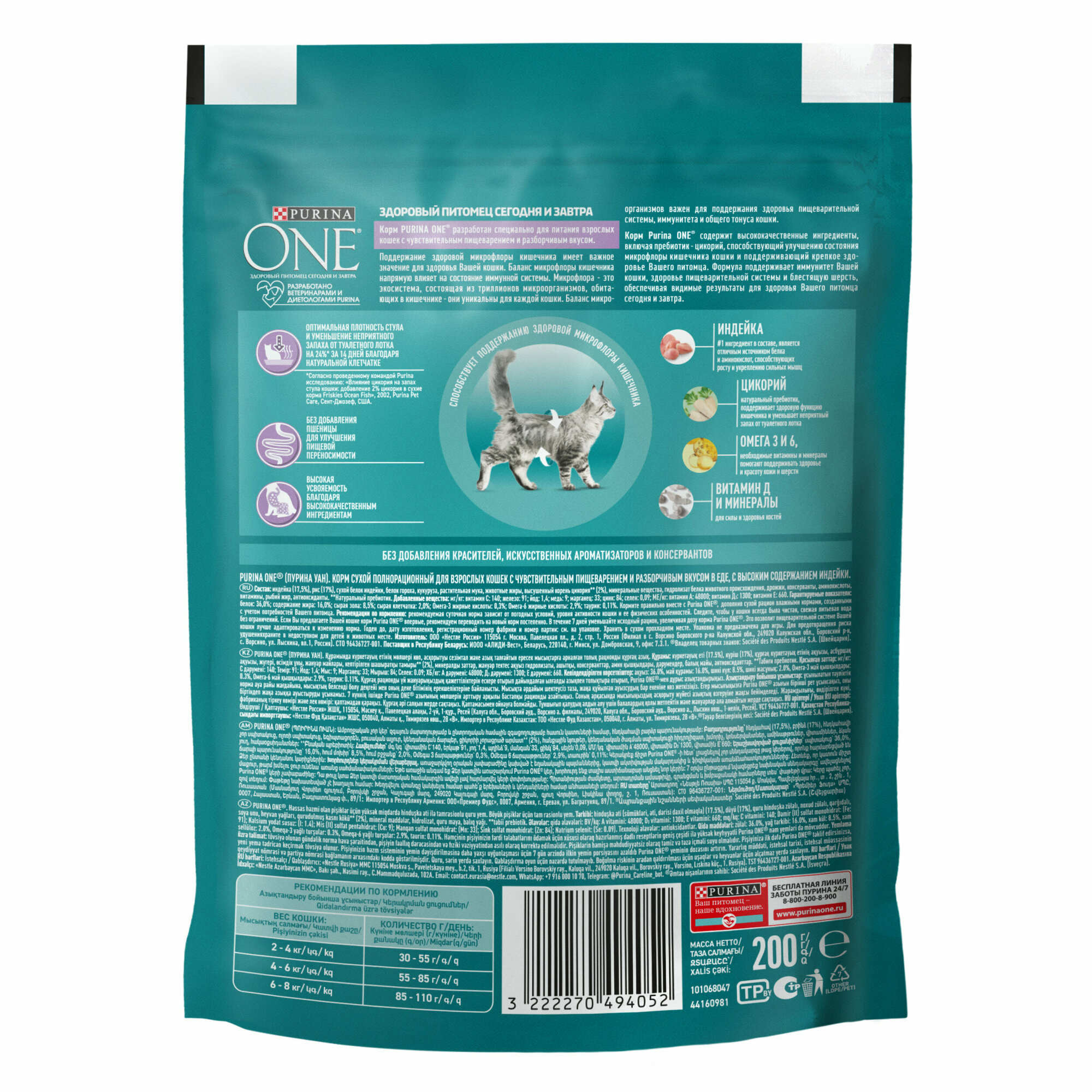 Сухой корм Purina ONE для взрослых кошек с чувствительным пищеварением и разборчивым вкусом в еде, с высоким содержанием индейки и рисом, 200 г
