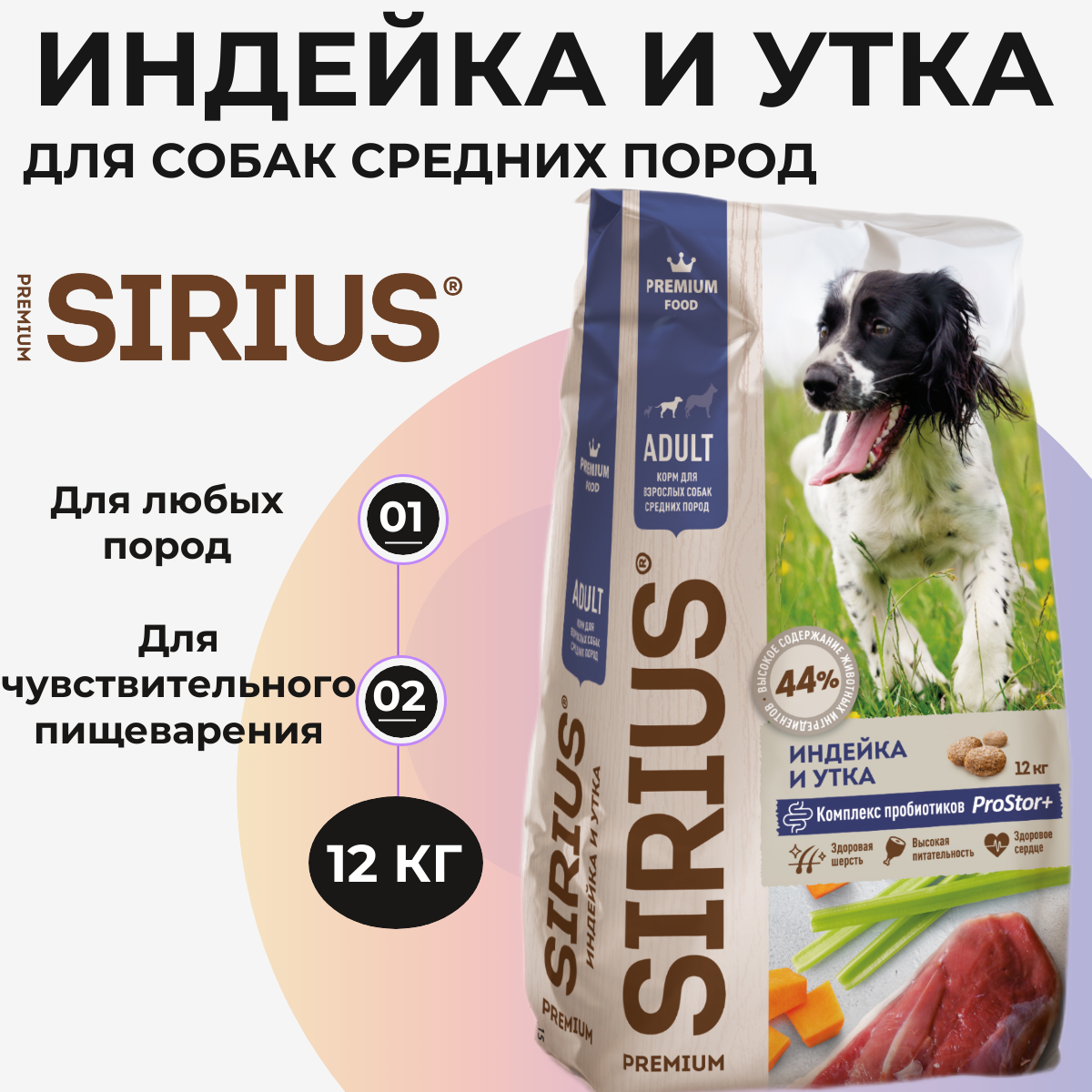 Сухой корм Sirius (Сириус) для средних пород собак, индейка и утка, 12 кг