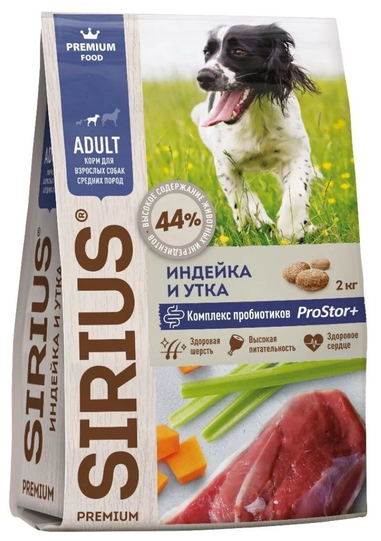 Сухой корм сириус SIRIUS PREMIUM для взрослых собак средних пород, индейка и утка с овощами, 2 кг