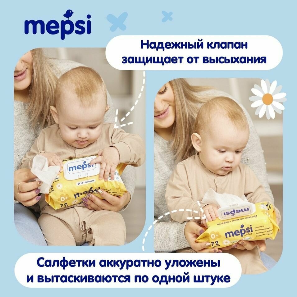 Влажные салфетки детские 72 шт с клапаном MEPSI, ЭКО, алое вера. Подходят для всех типов кожи и для лица, рук, интимной гигиены, новорожденных, уборки, сосок