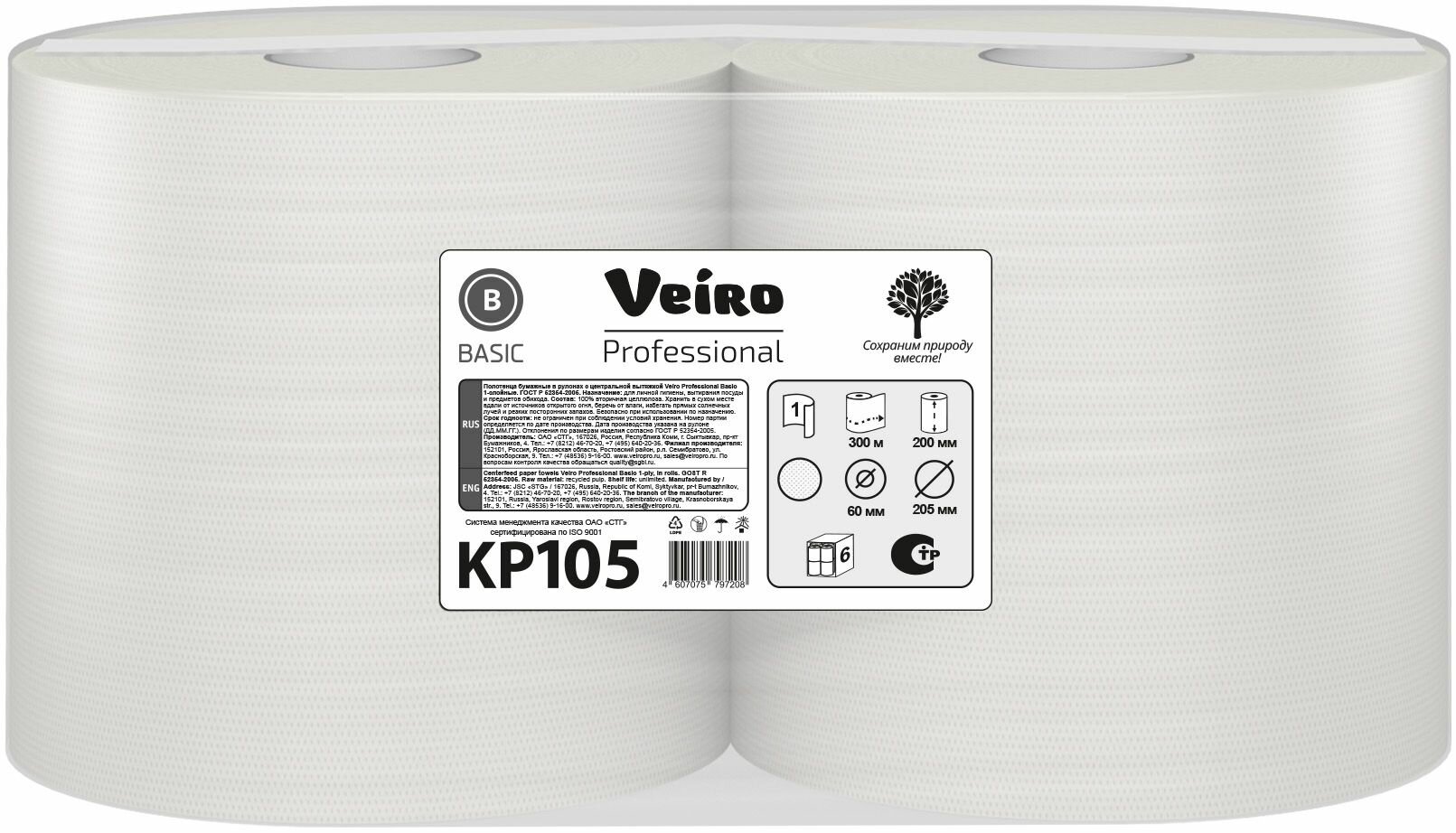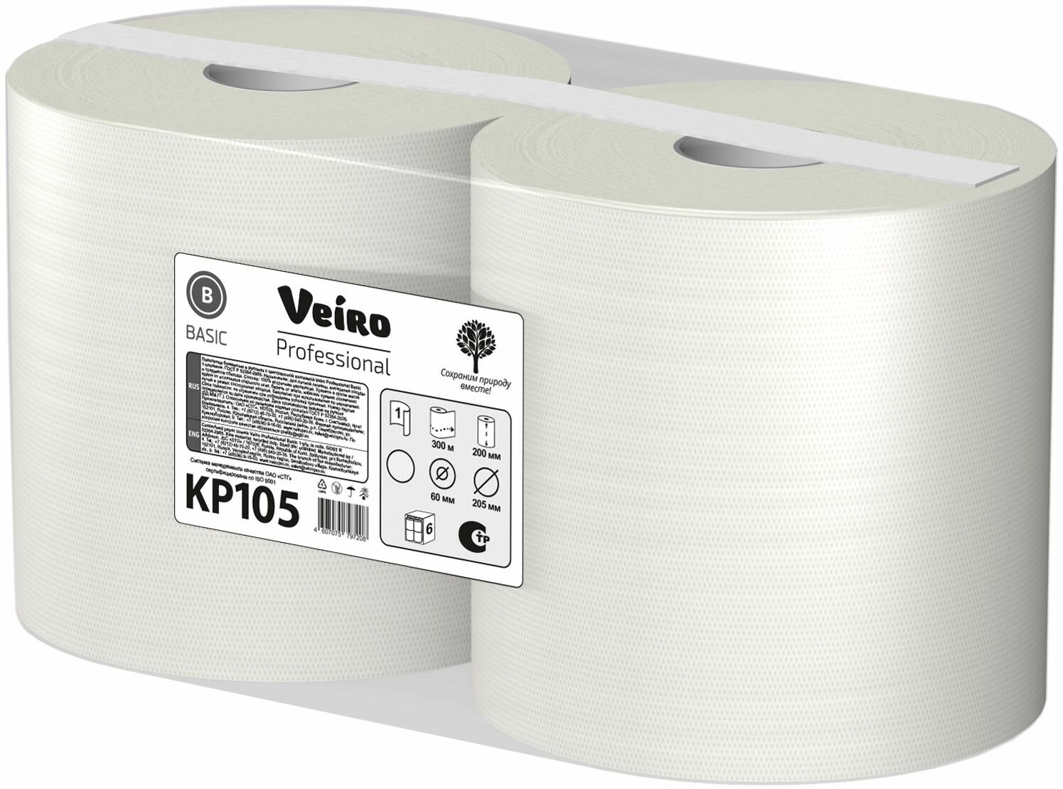 Полотенца бумажные Veiro Professional Basic KP105 рулонные, с центральной вытяжкой, однослойные, 1 упаковка - 6 рулонов по 300 метров