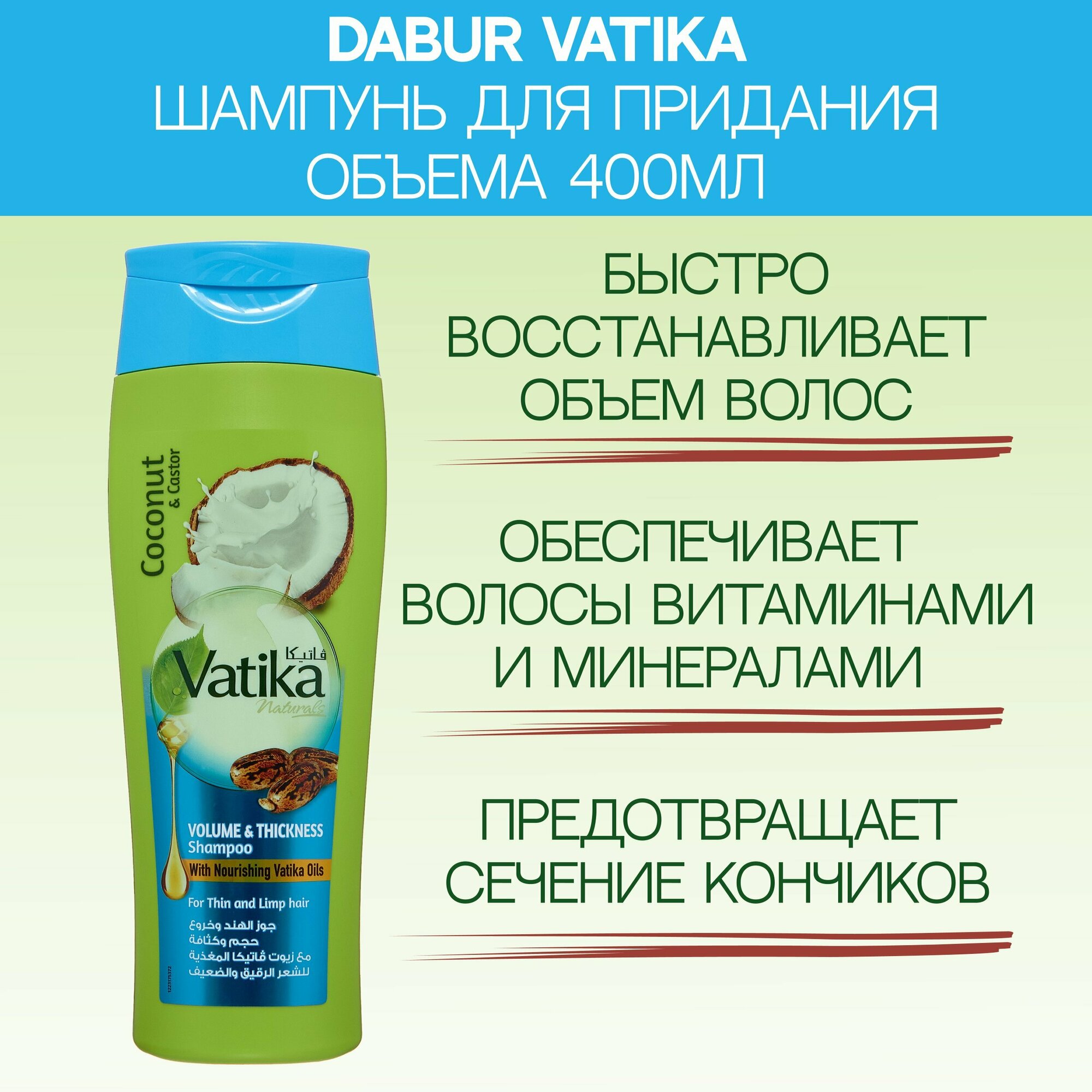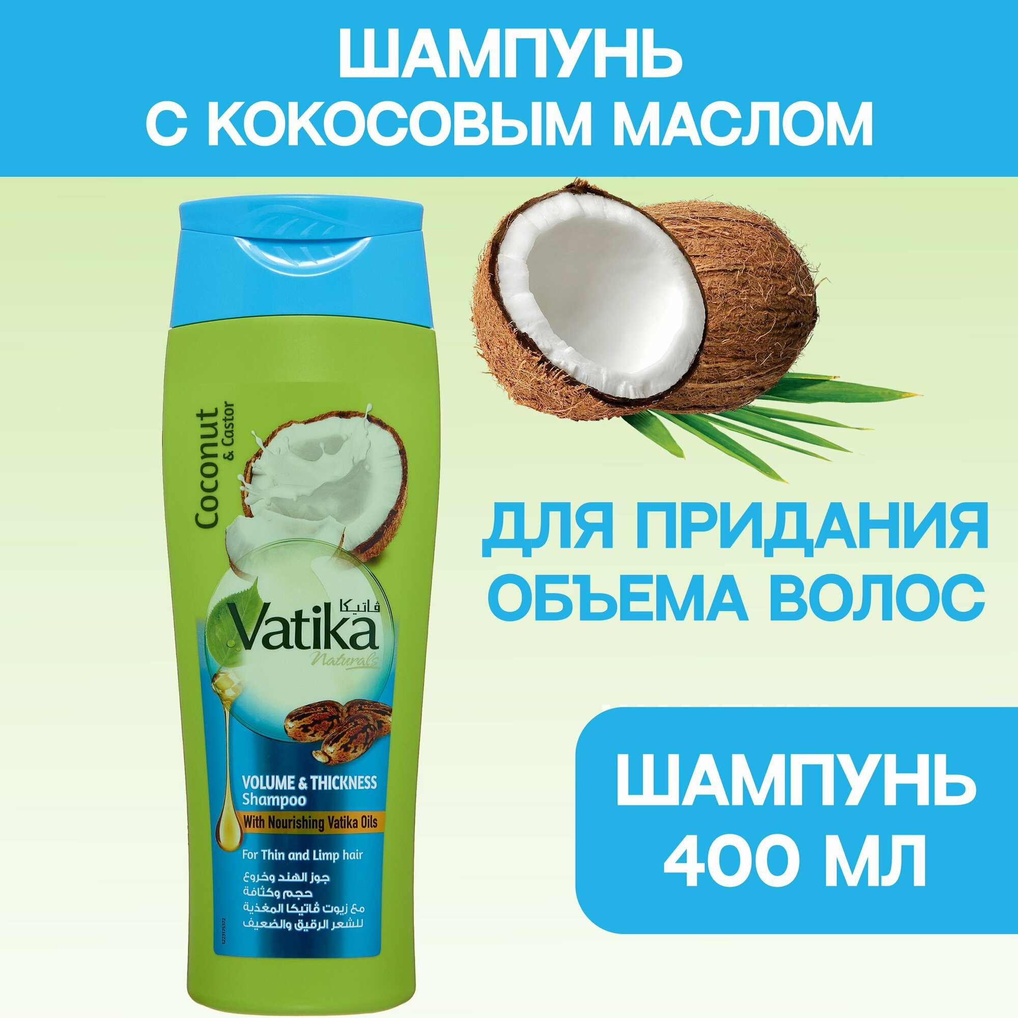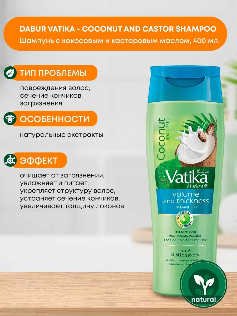 Dabur Vatika COCONUT AND CASTOR Шампунь кокос И касторовое масло объем и толщина для тонких волос, Дабур Ватика 400 мл