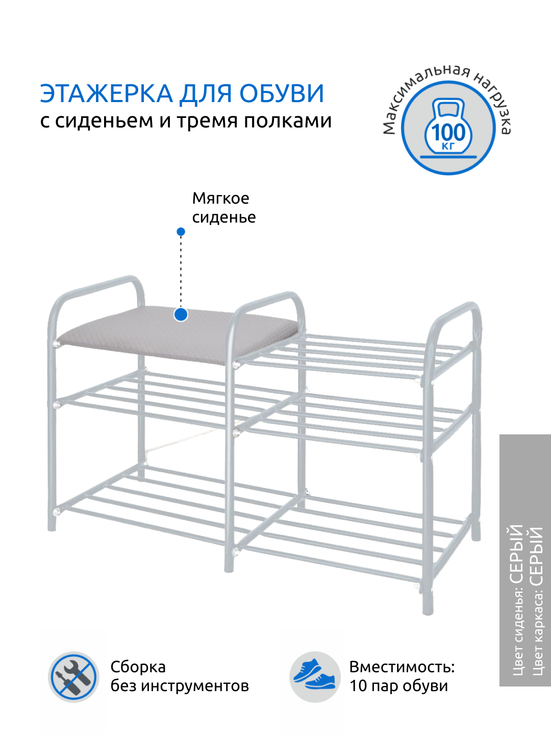 Этажерка для обуви Люкс арт.ЭТЛ3/С трехъярусная, каркас серый, сиденье цв.серый