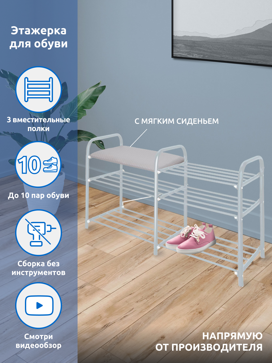 | Минусы: | Вмещается 8-10 пар обуви, сапоги можно только на верх поставить |