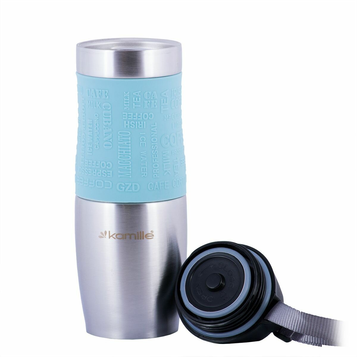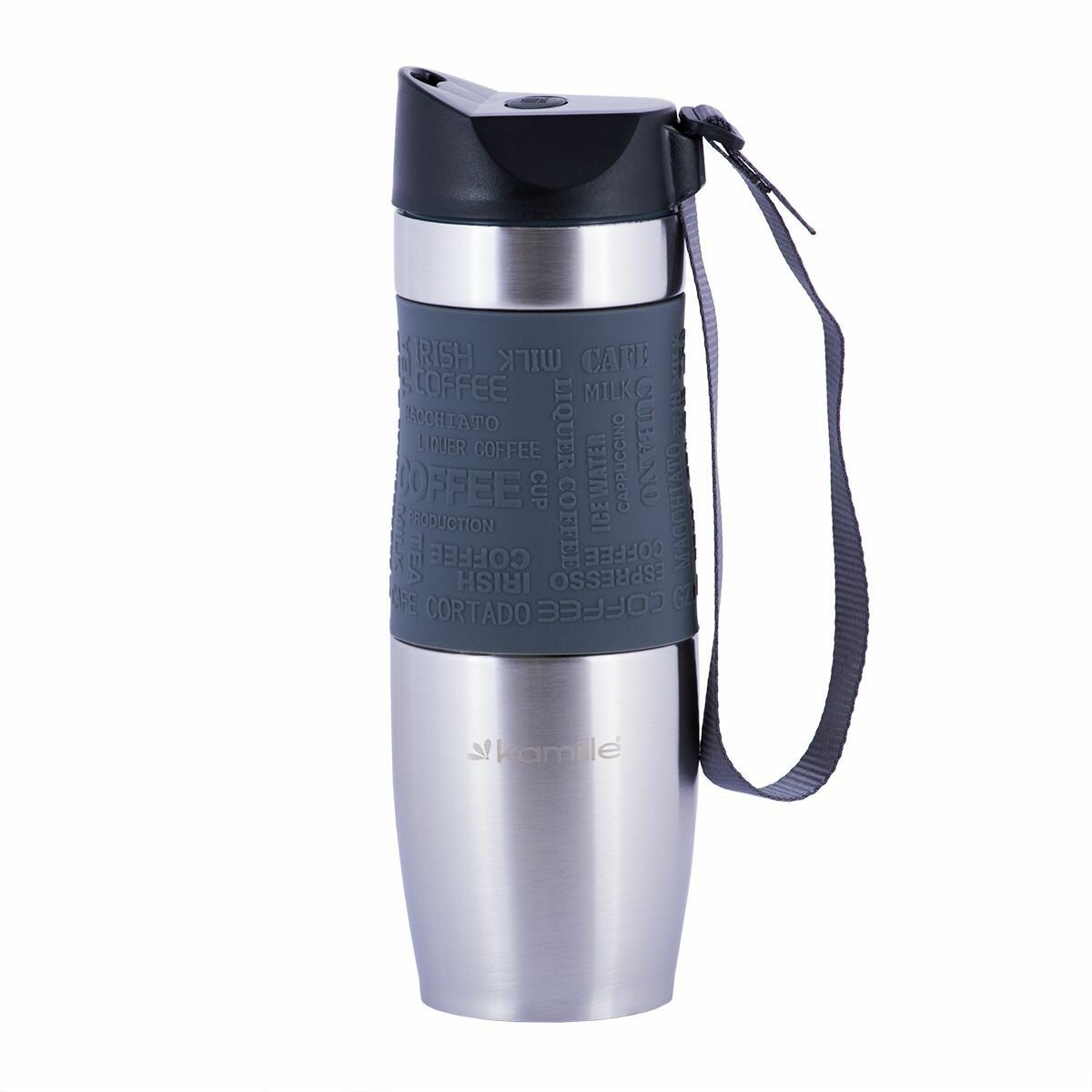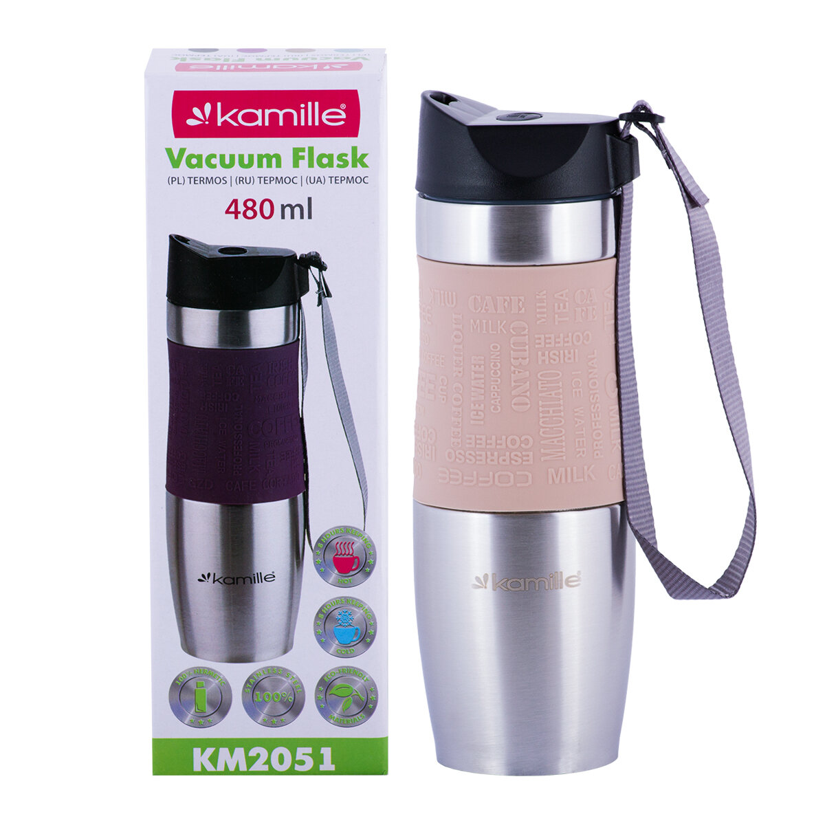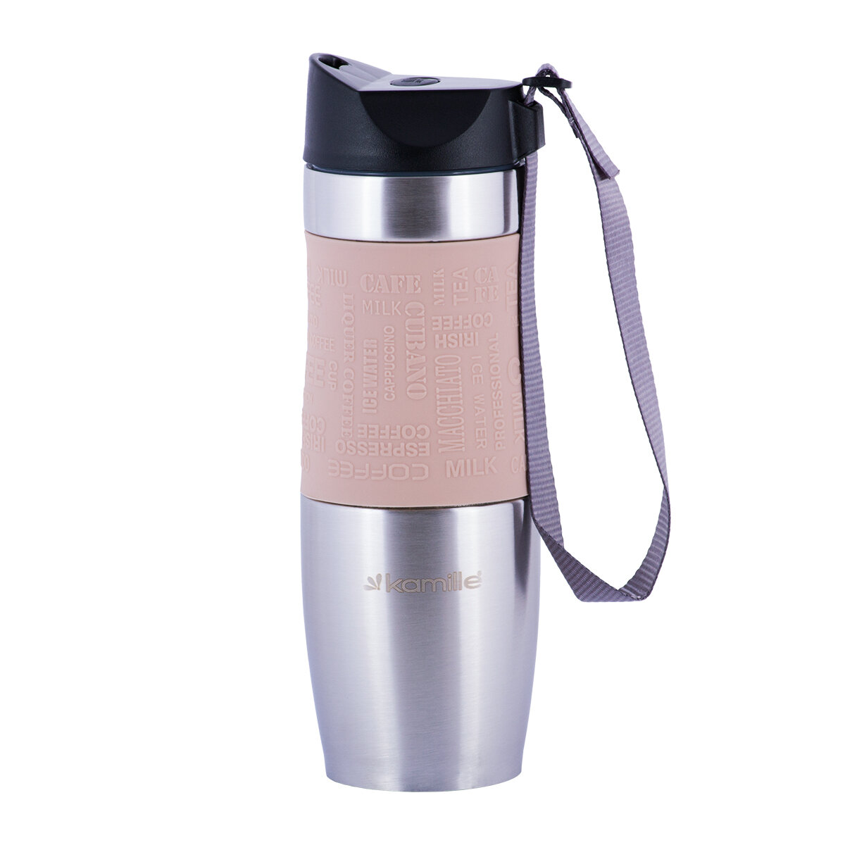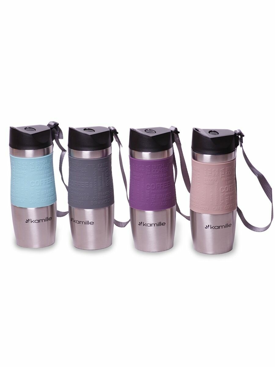 Термокружка 480мл из нержавеющей стали с TPR-вставкой и ремешком (серая, фиолет., голубая, беж.) Kamille 2051