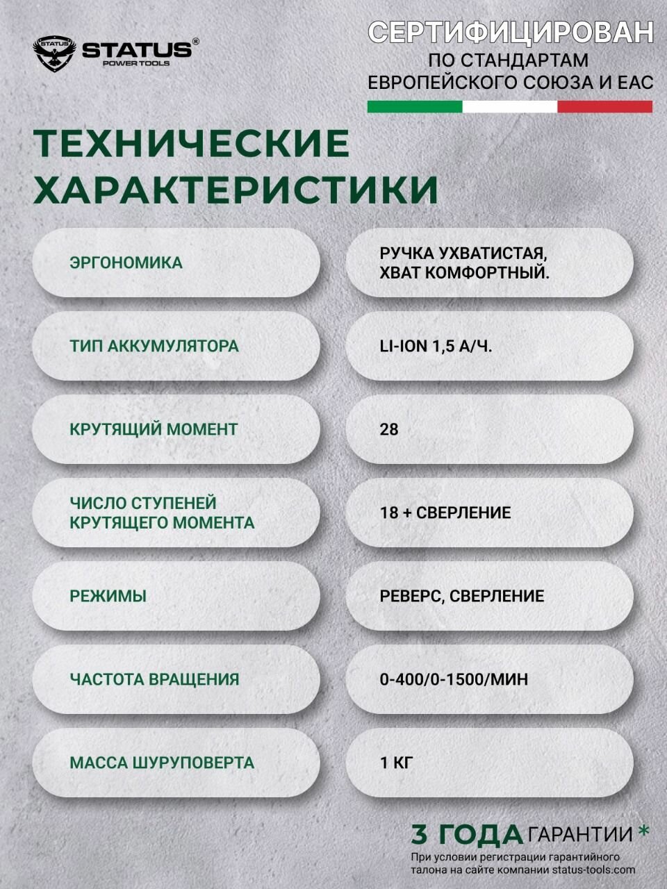 STATUS 07125301 Дрель-шуруповерт аккумуляторная (12В, 1.5Ач, Li-Ion) STATUS CTX12-2Li