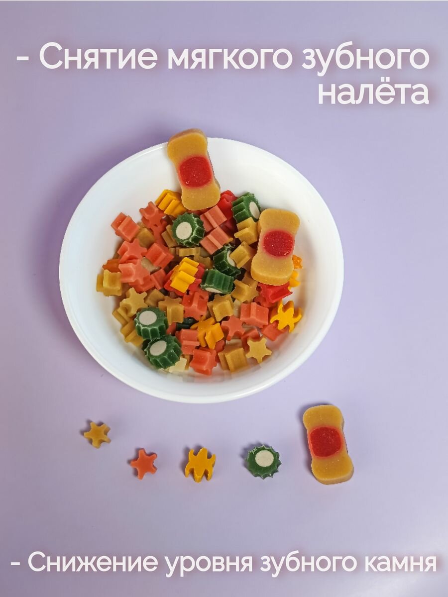| Минусы: | Содержимое не соответствует фото на упаковке. Крупные красные, зеленые и оранжевые кусочки отсутствуют совсем. До этого в 2020 году покупала а магазине, тогда было все идеально. Больше заказывать не буду, проще самим порезать палочки жевательные, выйдет дешевле. |