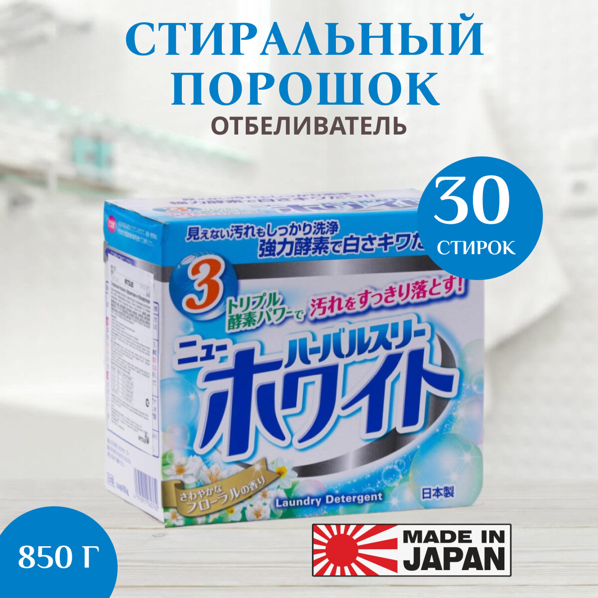 Mitsuei herbal three стиральный порошок с дезодорирующими компонентами, отбеливателем и ферментами, 850 гр