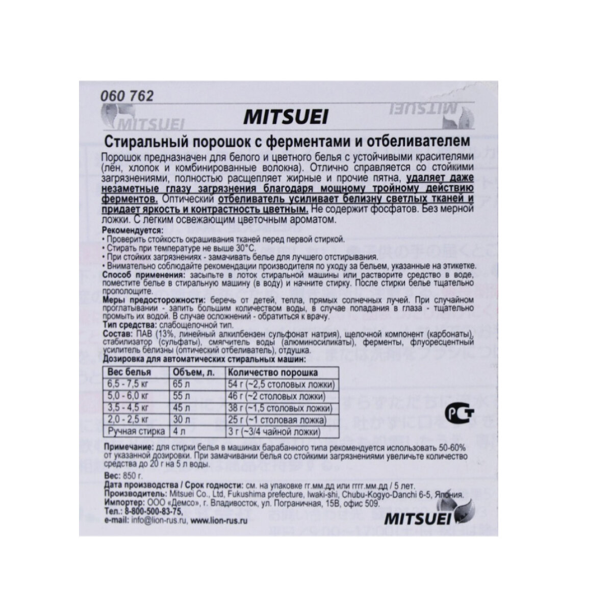 Mitsuei Стиральный порошок с ферментами и отбеливателем 850гр