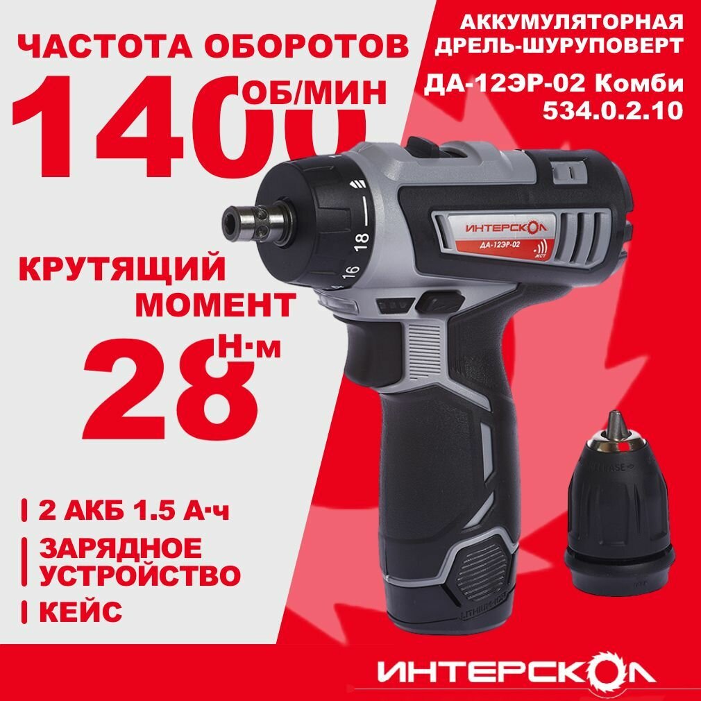 Аккумуляторная дрель-шуруповерт ИНТЕРСКОЛ ДА-12ЭР-02 комби 534 Li-Ion 1.5 А·ч 12 В х2 кейс