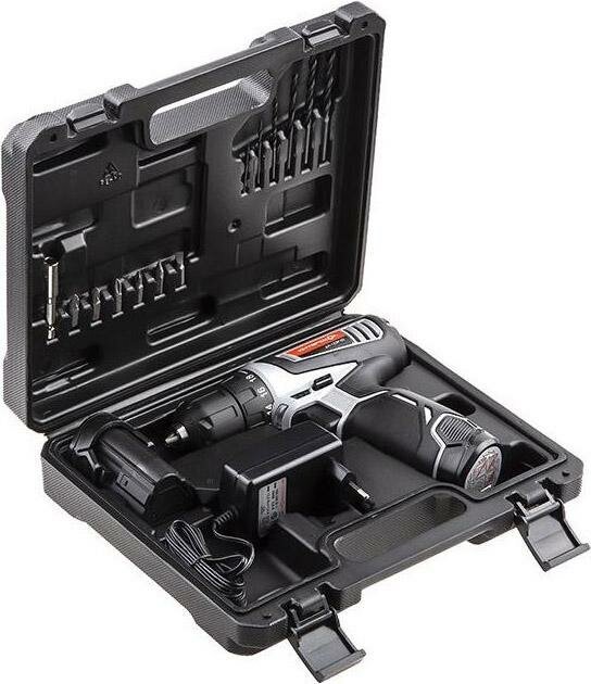 Приходит в компактном пластиковом чемоданчике с комплектом сверл и бит. |