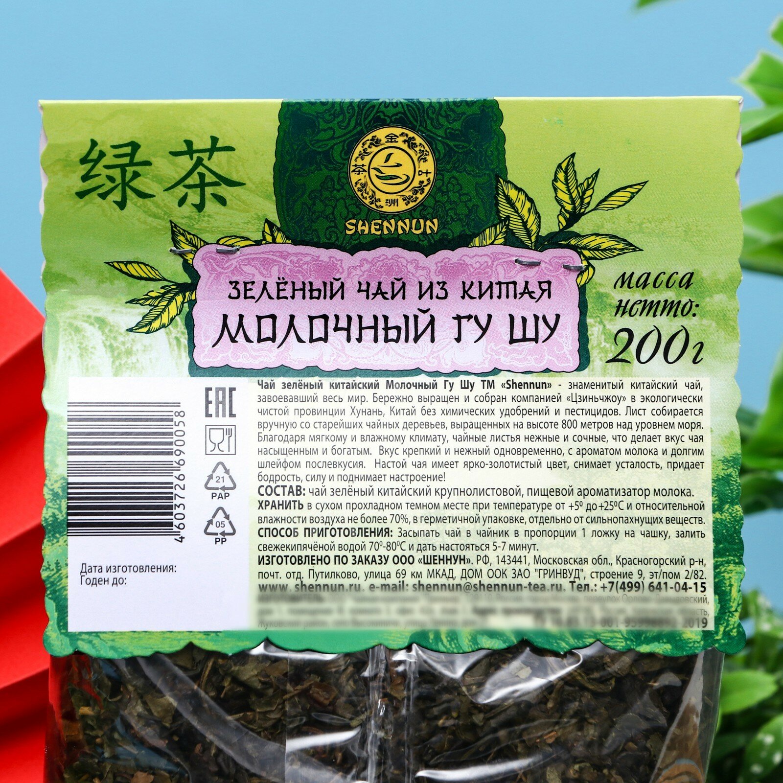 Зеленый китайский крупнолистовой чай в прозрачном пакете SHENNUN, молочный ГУ ШУ, 200 г 7944210