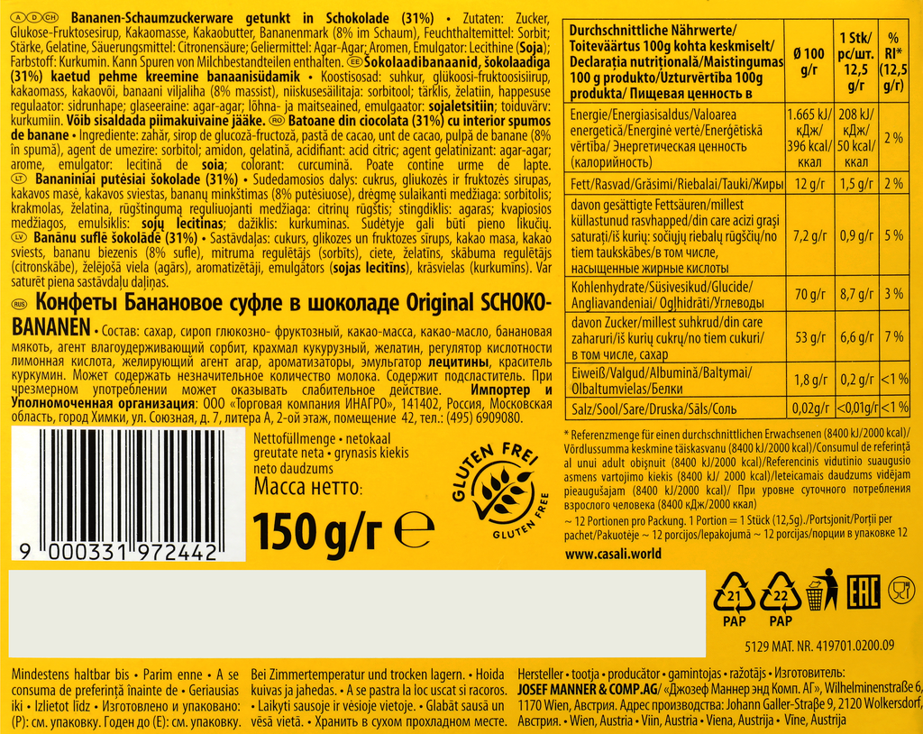 Купить Конфеты CASALI Schoko-Bananen Банановое суфле в шоколаде, 150г